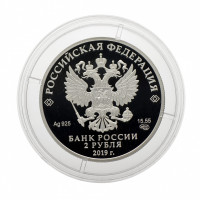 На аверсе монет расположено рельефное изображение государственного герба Российской Федерации, имеются надписи: «РОССИЙСКАЯ ФЕДЕРАЦИЯ», «БАНК РОССИИ», номинал монет – «2 РУБЛЯ», дата выпуска ? «2019», обозначение металла (буквы Ag), проба сплава – 925, масса драгоценного металла в чистоте – 15,55 г и товарный знак Санкт-Петербургского монетного двора. Качество чеканки монет – «ПРУФ».