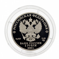 На аверсе расположено рельефное изображение государственного герба Российской Федерации, имеются надписи: «РОССИЙСКАЯ ФЕДЕРАЦИЯ», «БАНК РОССИИ», номинал монеты – «2 РУБЛЯ», дата выпуска ? «2020», обозначение металла (буквы Ag), проба сплава – 925, масса драгоценного металла в чистоте – 15,55 г и товарный знак Санкт-Петербургского монетного двора. Качество чеканки монет – «ПРУФ».