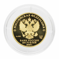 На аверсе расположено рельефное изображение государственного герба Российской Федерации, имеются надписи: «РОССИЙСКАЯ ФЕДЕРАЦИЯ», «БАНК РОССИИ», номинал монеты – «100 РУБЛЕЙ», дата выпуска ? «2020», обозначение металла (буквы Au), проба сплава – 999, масса драгоценного металла в чистоте – 15,55 г и товарный знак Санкт-Петербургского монетного двора.
