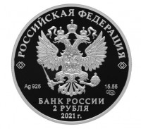 На лицевой стороне монеты расположено рельефное изображение Государственного герба Российской Федерации, имеются надписи: «РОССИЙСКАЯ ФЕДЕРАЦИЯ», «БАНК РОССИИ», номинал монеты: «2 РУБЛЯ», дата: «2021 г.», обозначение металла по Периодической системе элементов Д.И. Менделеева, проба сплава, товарный знак Санкт-Петербургского монетного двора и масса драгоценного металла в чистоте.