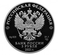 На лицевой стороне монеты расположено рельефное изображение Государственного герба Российской Федерации, имеются надписи: «РОССИЙСКАЯ ФЕДЕРАЦИЯ», «БАНК РОССИИ», номинал монеты: «3 РУБЛЯ», дата: «2021 г.», обозначение металла по Периодической системе элементов Д.И. Менделеева, проба сплава, товарный знак Санкт-Петербургского монетного двора и масса драгоценного металла в чистоте.