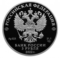 рельефное изображение Государственного герба Российской Федерации, над ним вдоль канта – надпись полукругом: «РОССИЙСКАЯ ФЕДЕРАЦИЯ», обрамленная с обеих сторон сдвоенными ромбами, под гербом: слева – обозначения драгоценного металла и пробы сплава, справа – содержание химически чистого металла и товарный знак монетного двора, внизу в центре в три строки – надпись: «БАНК РОССИИ», номинал монеты: «3 РУБЛЯ», год выпуска: «2022 г.».