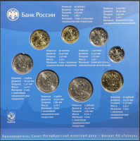 В набор входят 8 монет разного номинала: 1 копейка, 5 копеек, 10 копеек, 50 копеек, 1 рубль, 2 рубля, 5 рублей и 10 рублей.