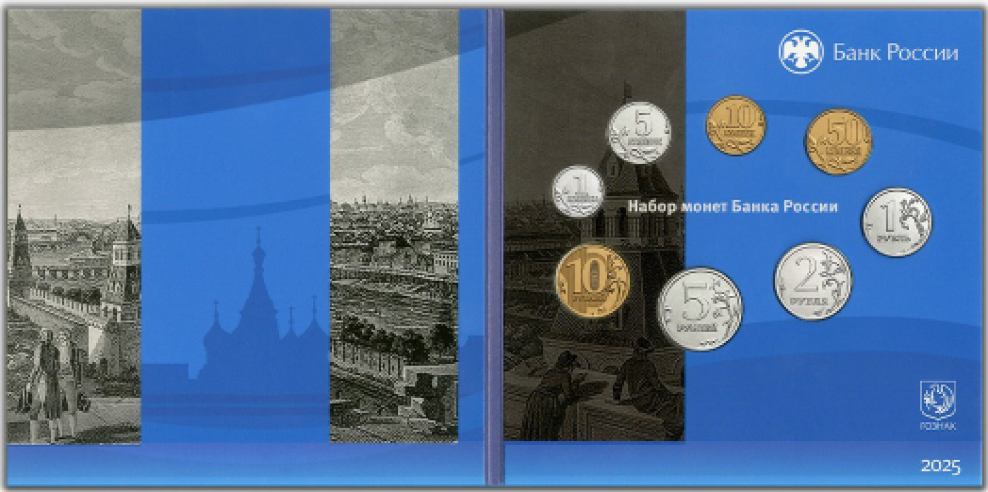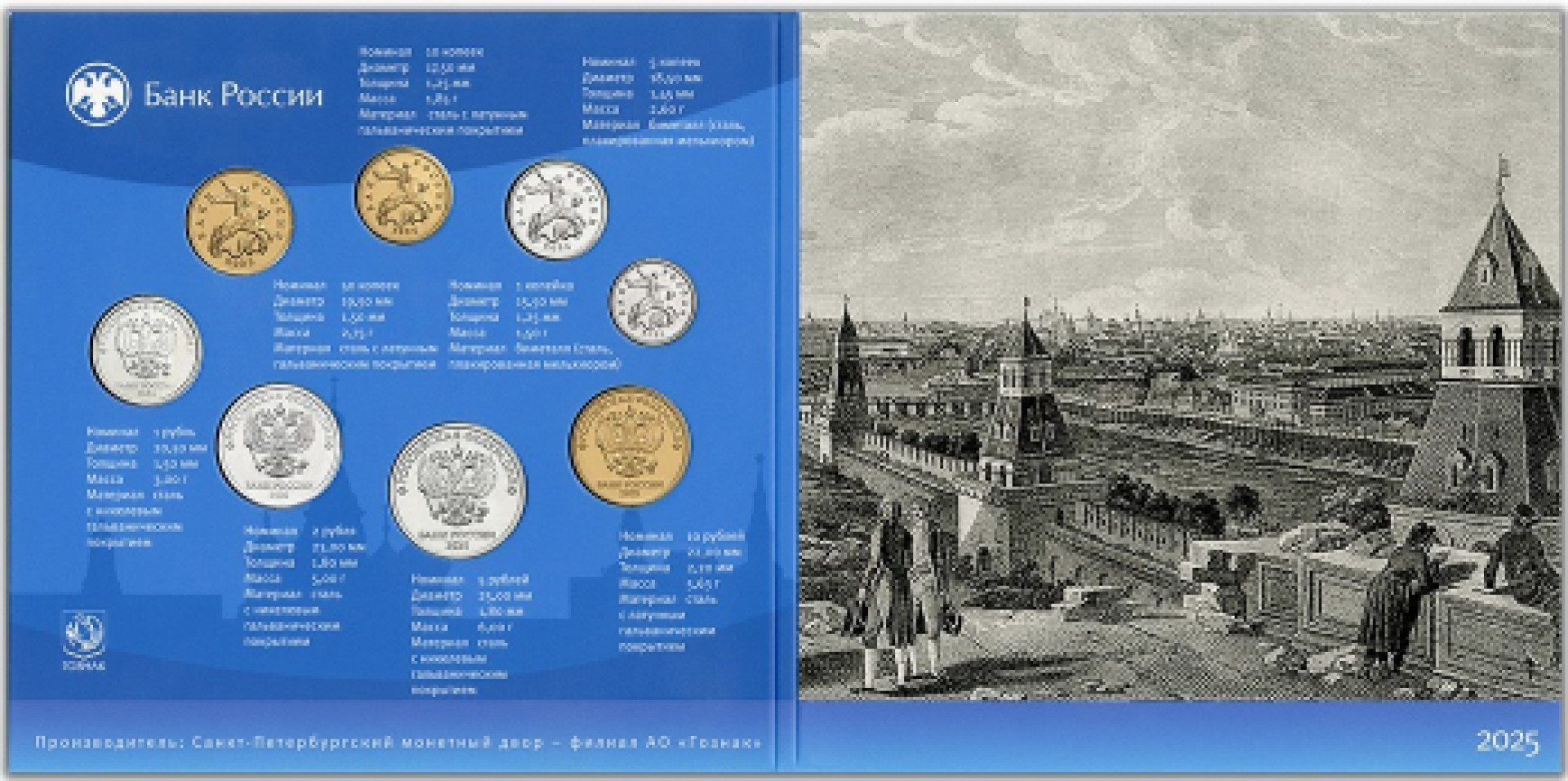 В набор входят 8 монет разного номинала: 1 копейка, 5 копеек, 10 копеек, 50 копеек, 1 рубль, 2 рубля, 5 рублей и 10 рублей.
