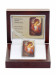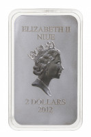 Имеет немного выпуклую форму и рельефную поверхность, в точности повторяющую внешний вид оригинальной иконы великого мастера, дошедшей до наших дней. Страна-эмитент – Ниуэ, монета выпущена в 2012 году номиналом 2 новозеландских доллара, качество чеканки «БА». Изготовлена из серебра 999 пробы, вес монеты – 31,07 г.