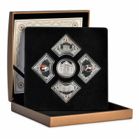 Серебряные монеты 925 пробы, номиналом 2 доллара каждая, вес центральной монеты – 9,25, вес остальных четырех монет – 11,1 г каждая, качество чеканки – «ПРУФ». Выпущены в 2012 году, страна-эмитент – Ниуэ.