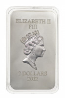Страна-эмитент – Фиджи, монета выпущена в 2012 году номиналом 2 доллара, качество чеканки «БА». Изготовлена из серебра 999 пробы, вес монеты – 31,07 г.
