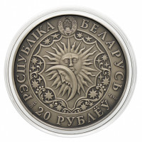На аверсе вверху – рельефное изображение государственного герба Республики Беларусь (страна-эмитент), в центре располагается фрагмент гравюры, на которой изображены солнце, луна и звезды.
