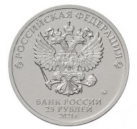 На лицевой стороне монеты расположено рельефное изображение Государственного герба Российской Федерации, над ним вдоль канта — надпись полукругом: «РОССИЙСКАЯ ФЕДЕРАЦИЯ», обрамленная с обеих сторон сдвоенными ромбами, справа — товарный знак Московского монетного двора, внизу под гербом в центре в три строки — надпись: «БАНК РОССИИ», номинал монет: «25 РУБЛЕЙ», дата: «2021 г.».