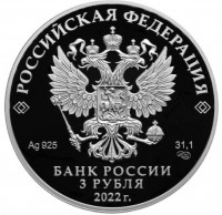 рельефное изображение Государственного герба Российской Федерации, над ним вдоль канта – надпись полукругом: «РОССИЙСКАЯ ФЕДЕРАЦИЯ», обрамленная с обеих сторон сдвоенными ромбами, под гербом: слева – обозначения драгоценного металла и пробы сплава, справа – содержание химически чистого металла и товарный знак монетного двора, внизу в центре в три строки – надпись: «БАНК РОССИИ», номинал монеты: «3 РУБЛЯ», год выпуска: «2022 г.».