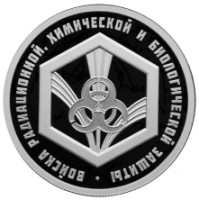 На монете «РХБЗ ЭМБЛЕМА» рельефное изображение малой эмблемы войск РХБЗ; по окружности – надпись «ВОЙСКА РАДИАЦИОННОЙ, ХИМИЧЕСКОЙ И БИОЛОГИЧЕСКОЙ ЗАЩИТЫ».