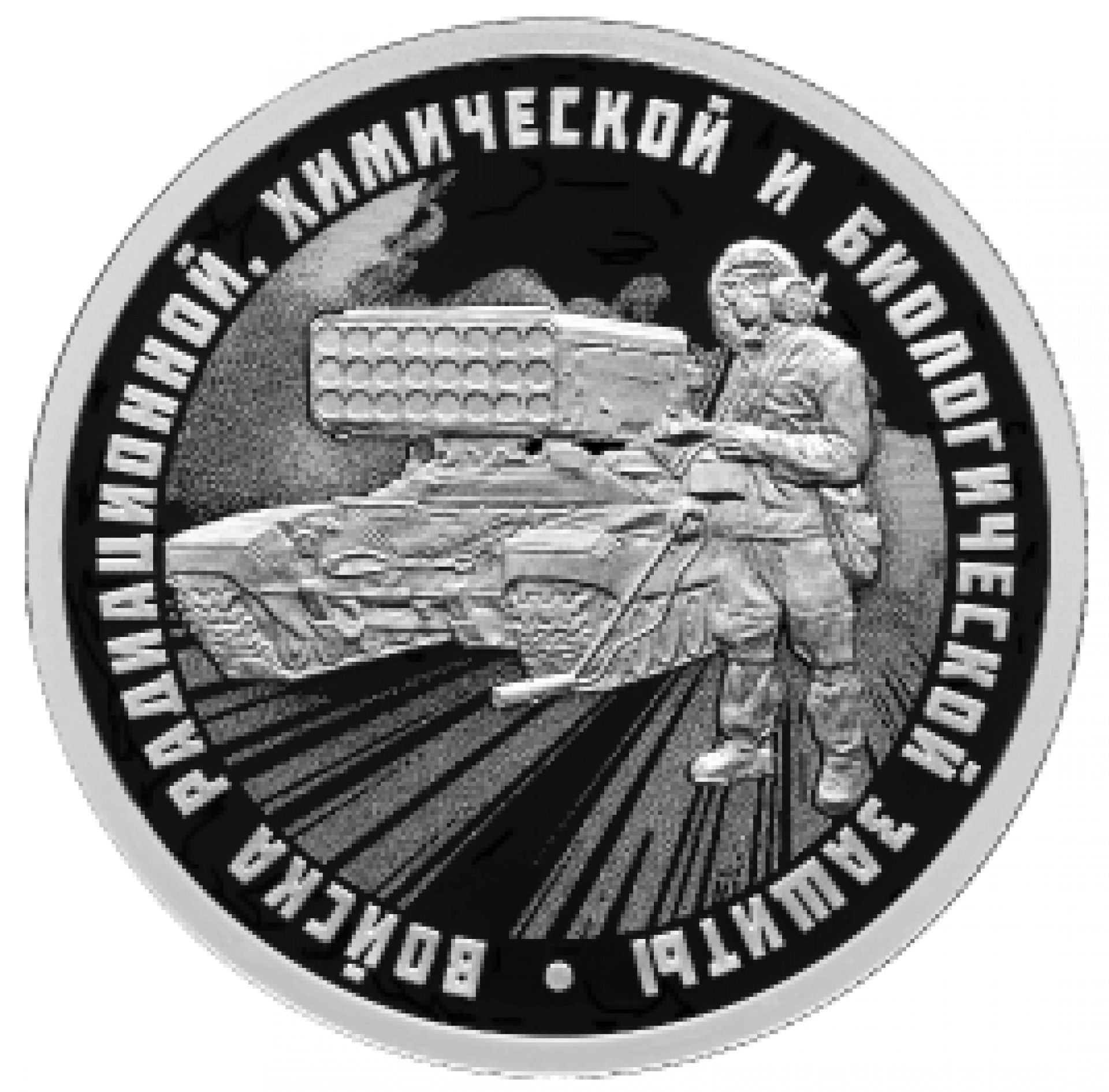На монете «РХБЗ ТОС» рельефное изображение военнослужащего в ОЗК с прибором радиационной разведки и боевой машины тяжелой огнеметной системы ТОС-1А «Солнцепек»; по окружности – надпись «ВОЙСКА РАДИАЦИОННОЙ, ХИМИЧЕСКОЙ И БИОЛОГИЧЕСКОЙ ЗАЩИТЫ».