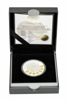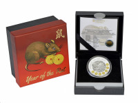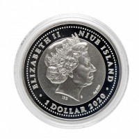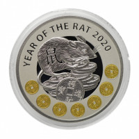 Серебряная монета из третьей серии «Лунный календарь» – год Крысы, 2020 года выпуска. Страна-эмитент – Ниуэ. Выполнена из серебра 999 пробы, ее вес – 17,50 г, номинал монеты составляет 1 новозеландский доллар, качество чеканки – «ПРУФ».