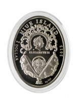 Монета выпущена в 2013 году, выполнена из серебра 925 пробы, ее вес – 15,55 г, номинал монеты составляет 1 доллар (страна-эмитент – Ниуэ), качество чеканки – «ПРУФ».
