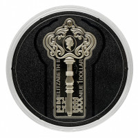 На аверсе монеты изображение ключика, сверху расположен портрет королевы Елизаветы II.